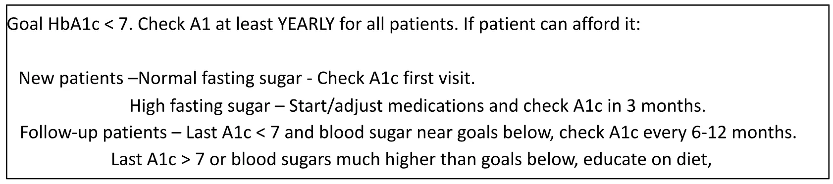 Ideal Blood Sugar Goals: Fasting Blood Sugars < 130. 2hr Postprandial Blood Sugars < 180. BP < 130/80 (Start with ACE or ARB and will likely need multiple medications). Urine Microalb 1x/yr. Statin for all patients > 40 y/o unless contraindicated. Yearly complete foot exam and eye exam. IF check chol, goals are LDL < 70-100, HDL > 40, TG < 200. Baseline EKG. Aspirin if CAD/Stroke. Healthy Eating, Regular Exercise (30 min/day+), Sustainable Weight Loss 5-7%. Ask about CV symptoms, and check weight, feet/peripheral pulses every visit. Quit Smoking!