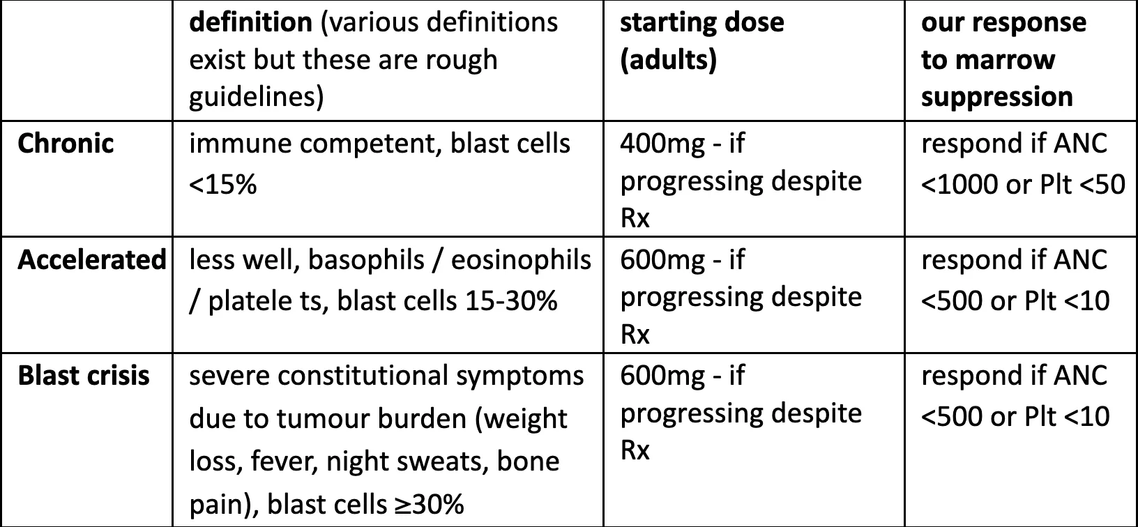- watch for neutropenia and thrombocytopenia (can occur at any time during therapy, but generally within 2-4 weeks of starting Imatinib) and hepatotoxicity