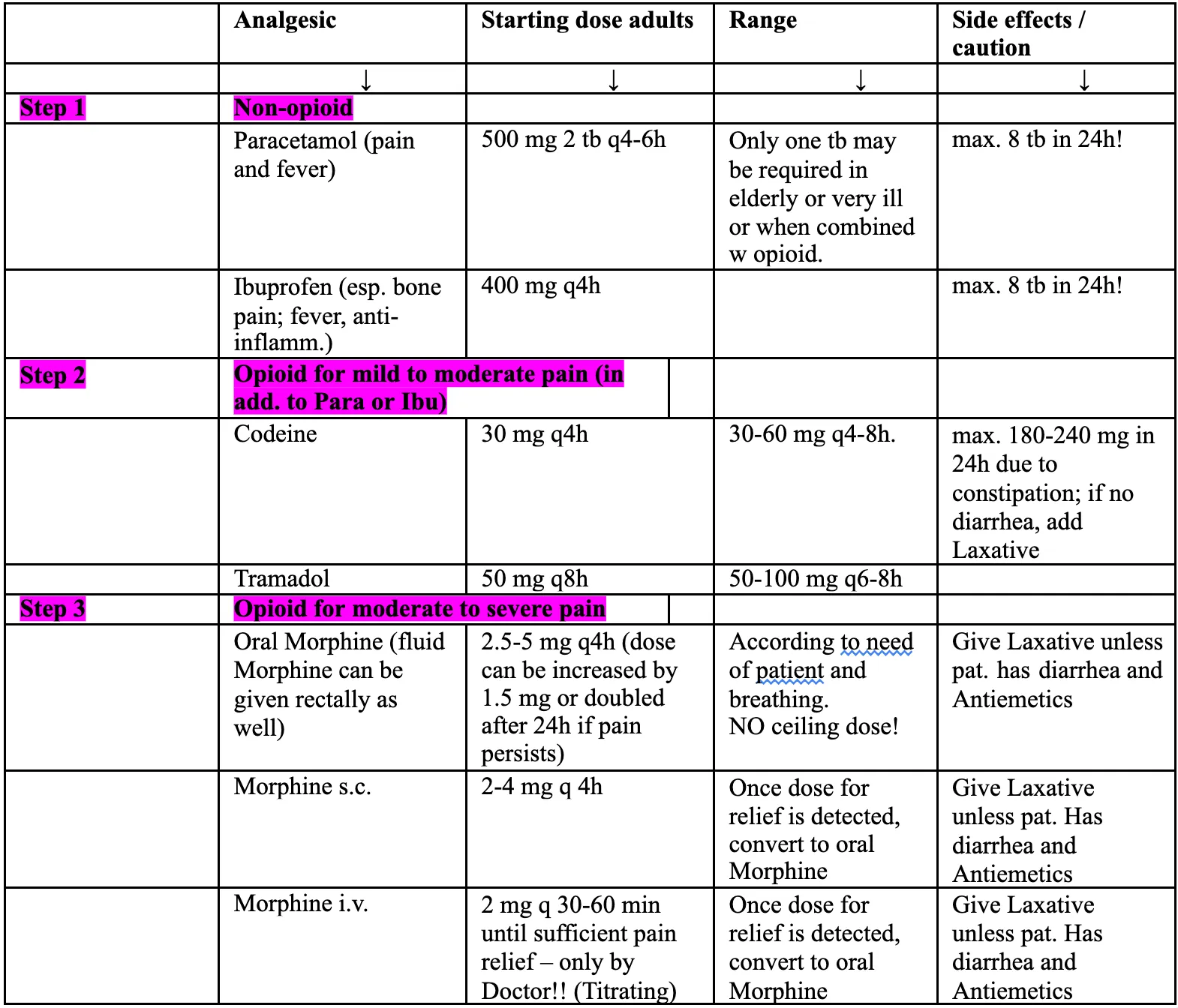 Section titled “WHO Analgesic Ladder adaptation for MMC:”- Step 1: Paracetamol (Acetaminophen) or NSAIDs (Ibuprofen is preferred, with 200 and 400mg tabs available)